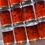 When finished, you need to skim off the foam that has risen to the top of the liquid. This then needs to be portioned out into sterilized jars (see some tips for that here). Just before you place the lid, give the mixture a stir to distribute the chili and herb pieces. Let lidded jars rest for at least a day if not more to have the jelly set.